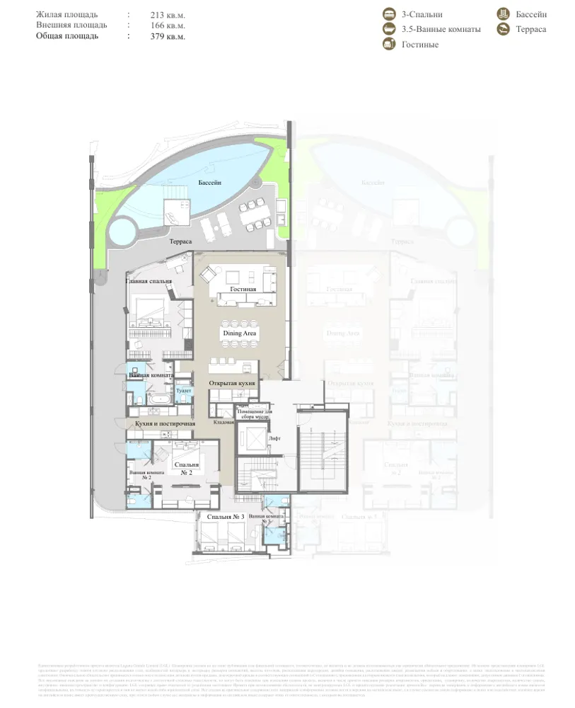 Камерный комплекс резиденций, где все апартаменты представлены в формате с тремя спальнями. Это упрощает позиционирование объекта на рынке и формирует чёткий премиальный сегмент: такой формат востребован у семей и арендаторов с высоким бюджетом, что напрямую влияет на стабильность спроса и ликвидность при перепродаже.
