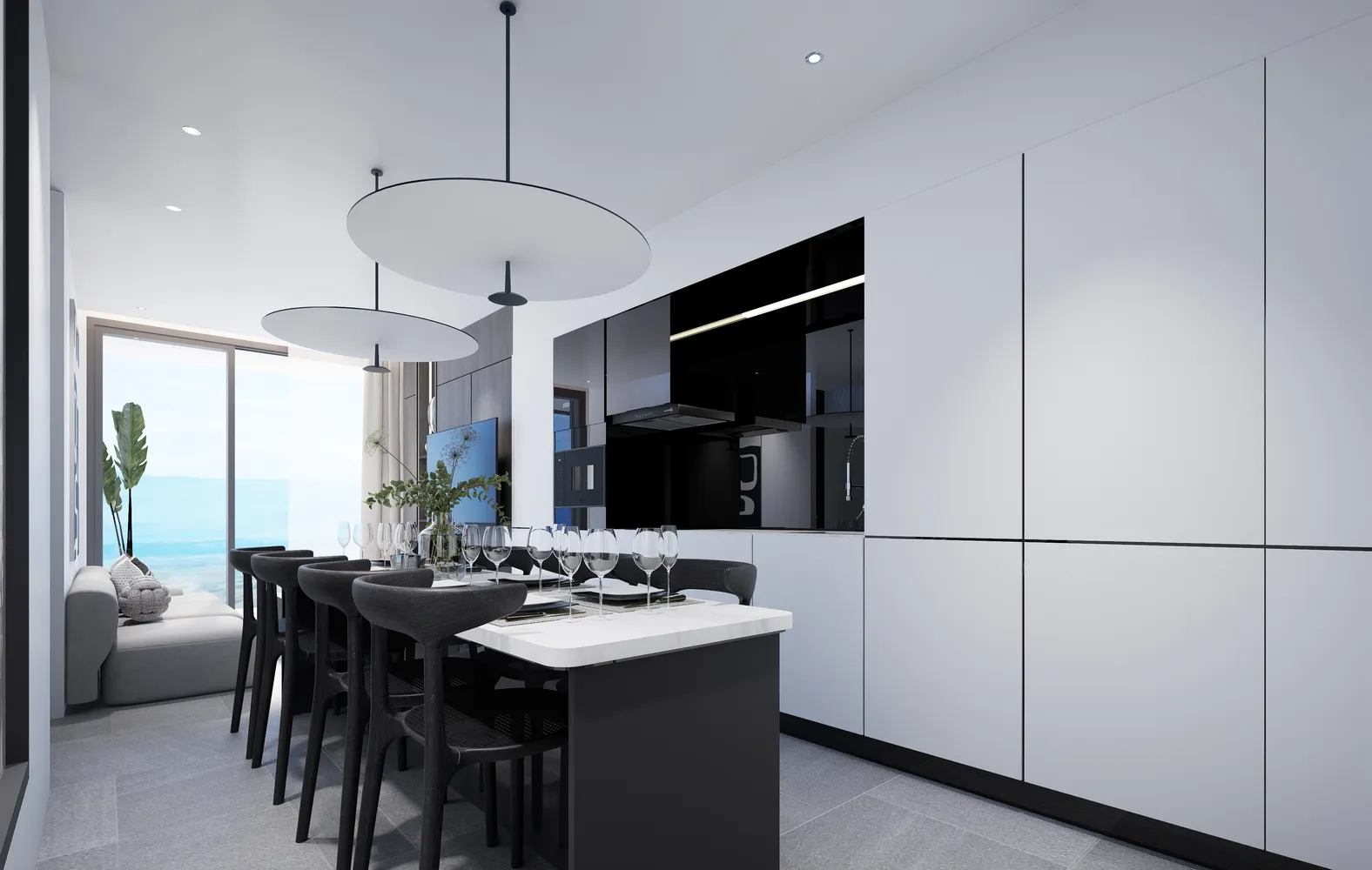 Апартаменты площадью 81 кв. м расположены на первом этаже и включают три спальни и три санузла. Планировка предусматривает просторную кухню и ванные комнаты, что обеспечивает рациональное использование площади и удобство при размещении нескольких резидентов. Панорамные окна выходят на бассейн, формируя открытый вид и хорошую освещённость помещений.