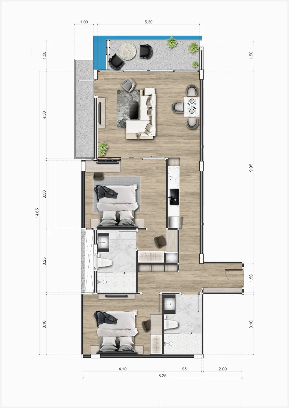 Апартаменты площадью 101 кв. м с 2 спальнями на 1 этаже расположены всего в 220 метрах от моря и предлагают вид на Андаманское море из панорамных окон, что обеспечивает максимальный визуальный контакт с водой и естественное освещение. Планировка включает две отдельные спальни, каждая со своим санузлом, а также просторную гостиную и балкон — такое решение создаёт комфортное пространство для семьи и делает апартамент функциональным как для проживания, так и для сдачи в аренду. Раздельные спальни с собственными ванными повышают приватность жильцов и расширяют возможности для длительного пребывания гостей, что увеличивает арендный потенциал объекта.