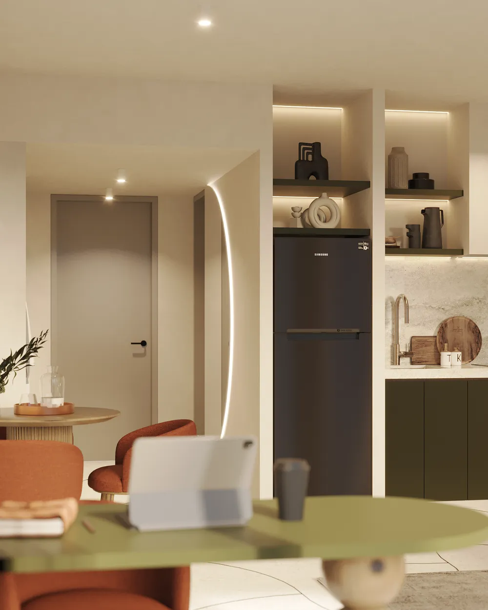 Архитектура проекта сочетает сингапурский модернизм, элементы экофутуризма и аутентику Бали. Панорамные фасады и вертикальное озеленение формируют выразительный внешний облик комплекса, а экологичные технологии — солнечные батареи, автоматический полив и системы сбора и очистки дождевой воды — помогают снижать эксплуатационные расходы и делают проект особенно привлекательным для международных арендаторов.
