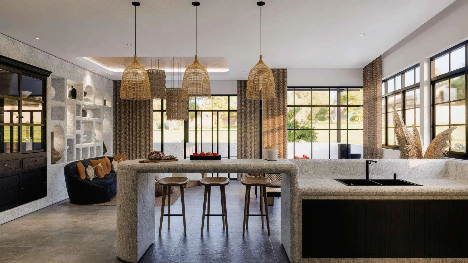 Высокие потолки, светлые тона в отделке, качественная мебель и декоративное освещение создают ощущение воздушности и простора. Просторная мастер-спальня с отдельным санузлом идеально подойдёт для собственников, вторая спальня — для гостей. Панорамные окна наполняют пространство естественным светом и визуально расширяют его.
