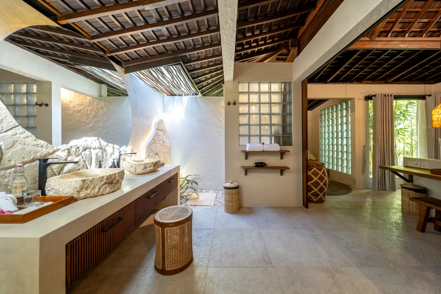В продаже — односпальная вилла Garden Villa площадью 65 м², выполненная из тёмного железного дерева и натурального камня. В интерьере использованы элементы местной флоры и органичные формы, подчёркивающие философию жизни в гармонии с природой. Вилла включает просторную спальню, ванную комнату, жилую зону и террасу — формат, идеально подходящий для отдыхающих пар и индивидуальных резидентов.