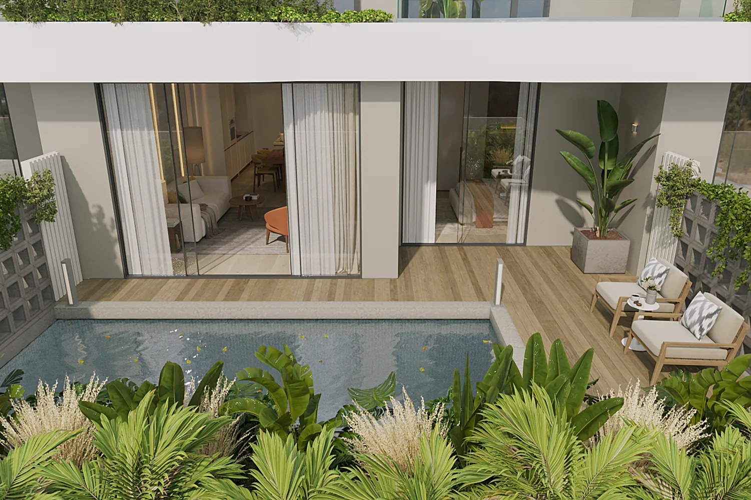Апартаменты на 1 этаже площадью 93,1 кв. м в Layan Green Park выделяются за счёт собственной террасы с приватным бассейном — формата, который приближен к вилле и позволяет устанавливать более высокий арендный тариф. Планировка включает отдельную спальню, санузел и просторную кухню-гостиную с прямым выходом на террасу, что особенно востребовано у арендаторов, ориентированных на приватность и повышенный уровень сервиса.