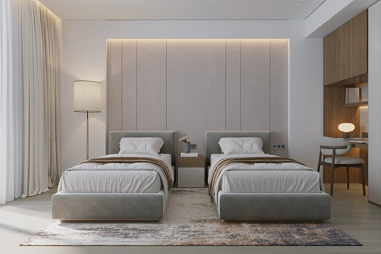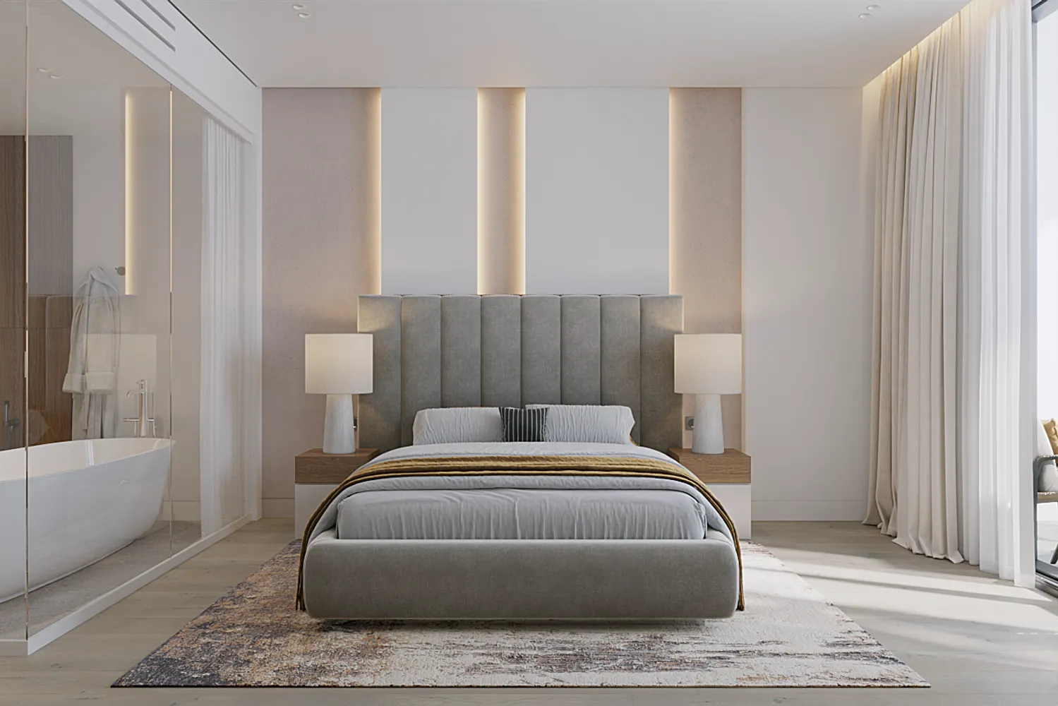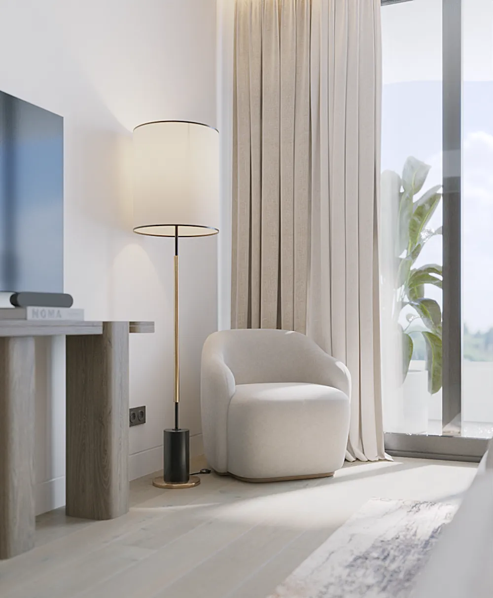 Апартаменты 106,8 кв. м с 2 спальнями в Layan Green Park спроектированы с акцентом на приватность и функциональность — формат, востребованный в семейной и длительной аренде. Спальни расположены по разные стороны от кухни-гостиной и каждая имеет собственный балкон, что повышает комфорт проживания для двух независимых резидентов или семьи. Одна из спален выполнена в формате мастер-спальни, второй санузел имеет вход из гостиной, что удобно для гостей и повышает эргономику планировки.