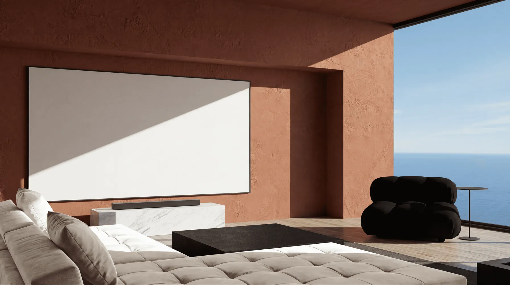 Мебель из тика, отделка травертином, мягкие тёплые оттенки — всё продумано до мелочей. Вид на океан
