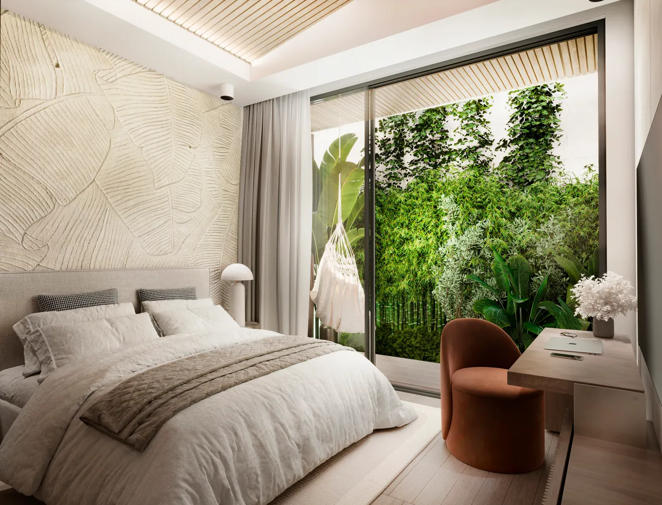Вилла площадью 140 м² расположена в 3 минутах езды до пляжа — такая дистанция формирует стабильный спрос на аренду и повышает ликвидность при перепродаже. Наличие собственного бассейна и панорамных окон с видом на сад усиливает позиционирование в более высоком сегменте: визуальные характеристики напрямую влияют на стоимость аренды и заполняемость объекта.