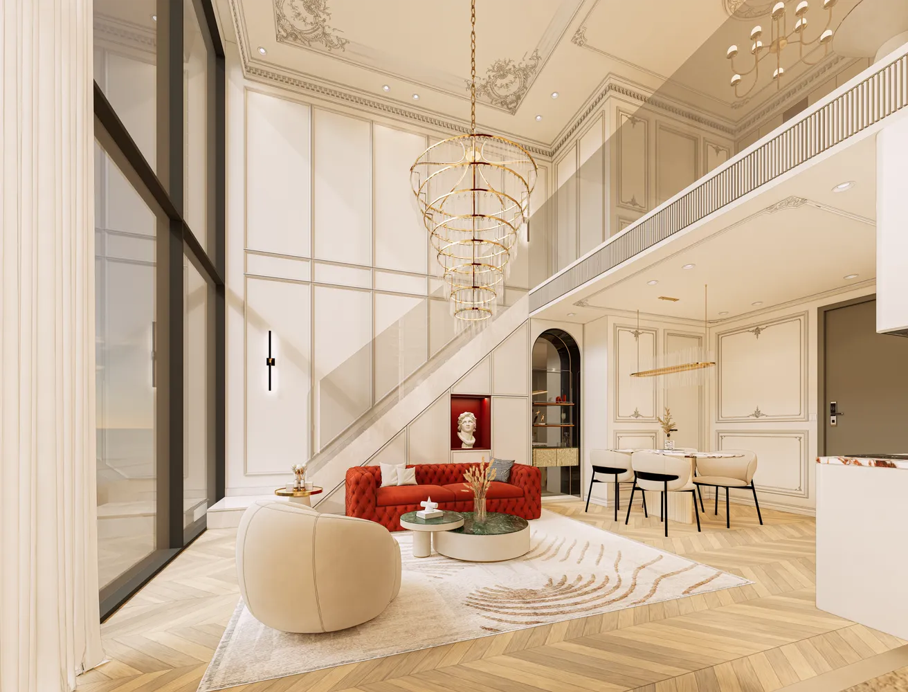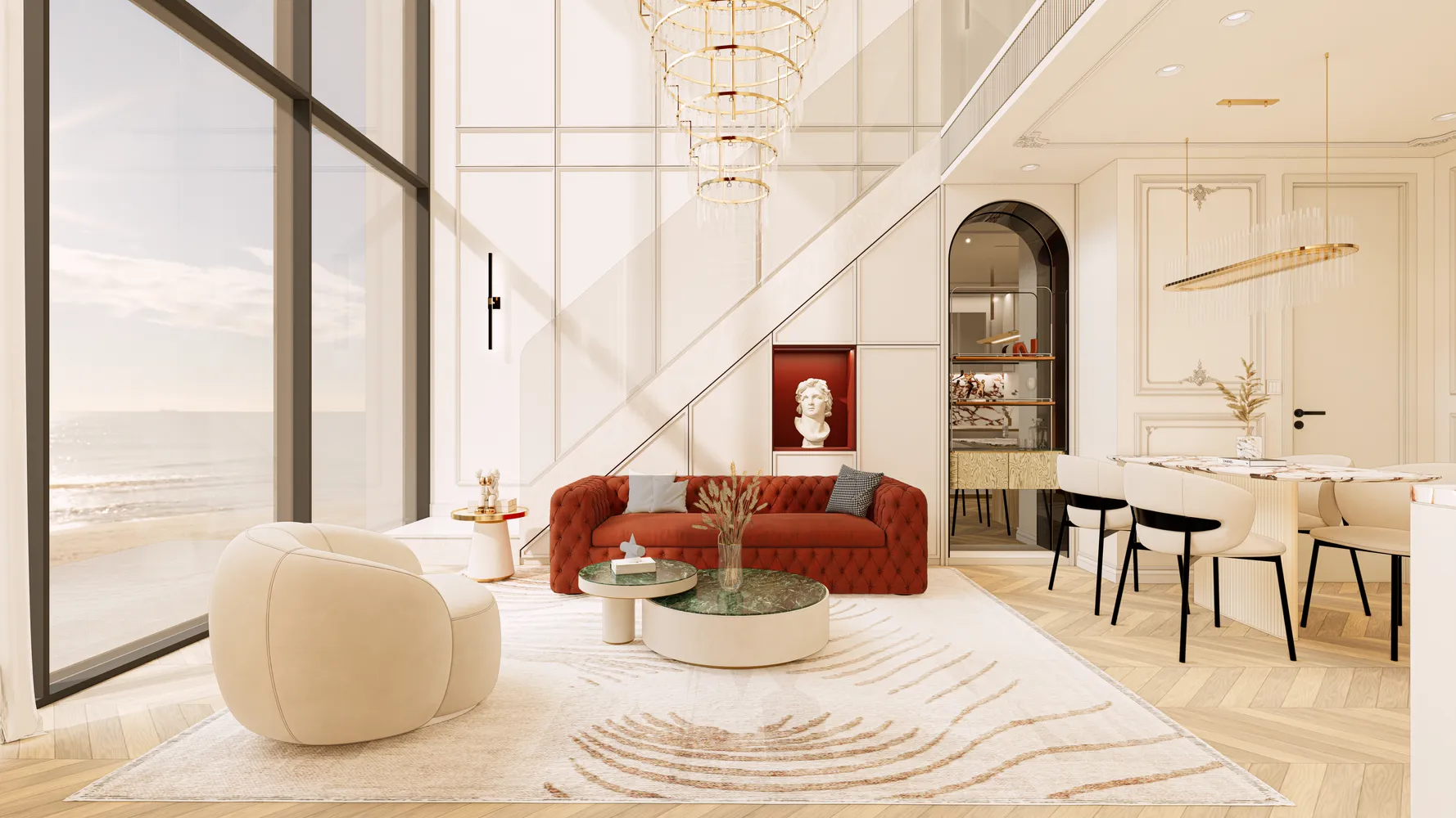 Премиальный дуплекс с одной спальней площадью gross area 67 кв.м. (net area 57 кв.м.), расположенный на 33 этаже в первой береговой линии, предлагает редкий формат вертикальной планировки: приватная спальня с санузлом на втором уровне и отдельная гостиная зона с кухней, обеденной зоной и гостевым санузлом — на первом. Панорамные окна с боковым видом на море, продуманная эргономика и светлый интерьер с элементами роскоши создают конкурентное преимущество для аренды в сегменте туристов и digital-номадов.