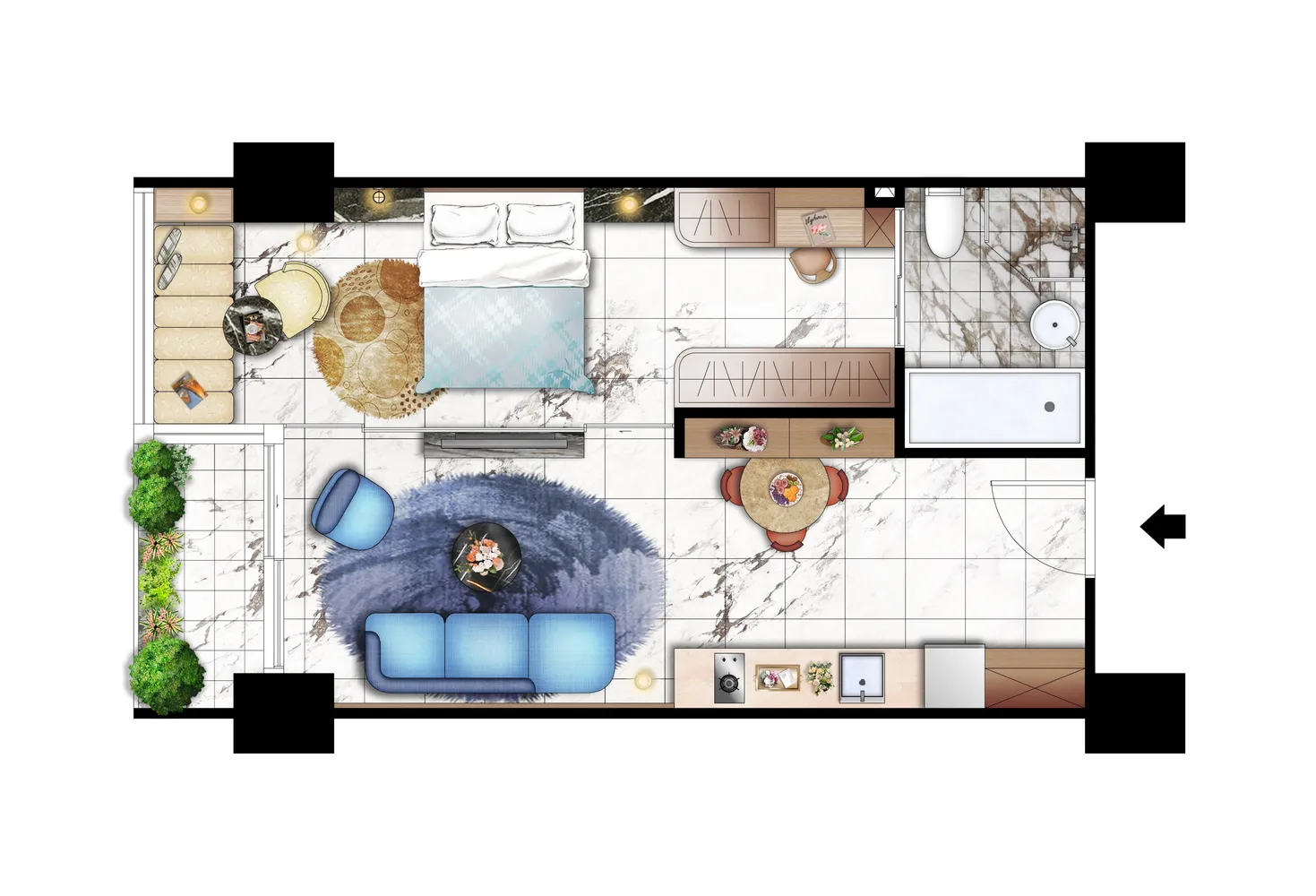 Апартаменты площадью gross area 75 кв.м. (net area 50 кв.м.) представлены в формате просторного 1 bedroom, ориентированного на комфортное проживание в деловом центре Пномпеня. Планировка включает отдельную спальню с приватным санузлом, расширенную гостиную с кухонной зоной и балкон, что повышает функциональность пространства по сравнению с базовыми однокомнатными форматами. Такой тип апартаментов занимает промежуточную нишу между компактными и увеличенными лотами, сохраняя высокую ликвидность. Формат freehold обеспечивает полное бессрочное владение, а расположение в сейсмически спокойном регионе повышает надёжность инвестиции.
