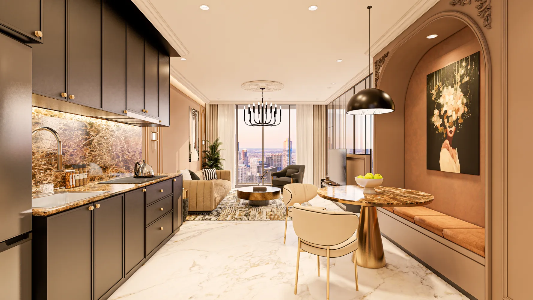 Архитектура комплекса выполнена в стилистике Gatsby с акцентом на выразительную геометрию и визуальную идентичность премиального уровня. Концепция поддерживается интерьерными решениями и приватной атмосферой общественных пространств. Формат 39-этажного здания с 600 апартаментами и панорамными видами на город усиливает статус проекта и повышает его привлекательность для аренды и перепродажи.