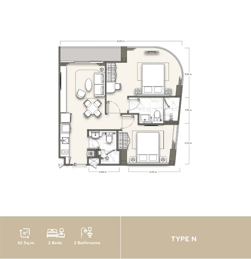 Апартаменты площадью 62 кв.м предлагают две спальни и два санузла, при этом один расположен в мастер-спальне и обеспечивает отсутствие прямого соседства спален друг с другом. Гостиная, столовая и кухонная зоны объединены в единое пространство, из гостиной предусмотрен выход на балкон. Главным преимуществом юнита является вид на море, относящийся к премиальной категории и усиливающий инвестиционный потенциал апартаментов.