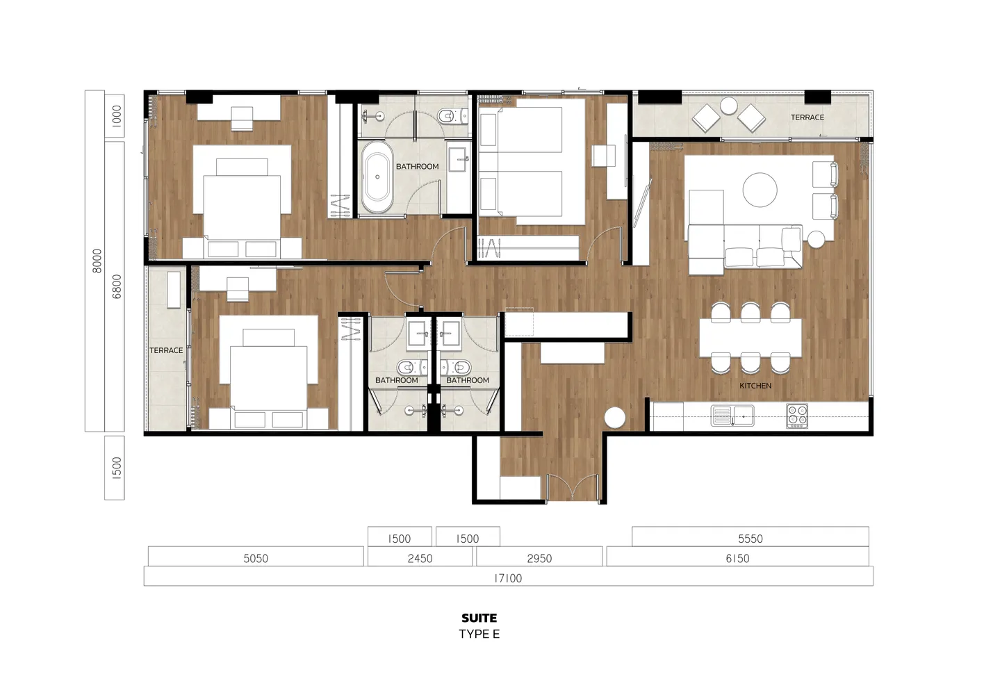 Уникальные апартаменты площадью 139,3 кв.м. — это редкий формат просторного жилья у моря. В планировке предусмотрены три спальни и три санузла: два из них расположены при спальнях, а один — гостевой, что особенно удобно для семьи и гостей. Две террасы на противоположных сторонах квартиры открывают панорамные виды на бассейн и зелёную территорию комплекса, создавая ощущение тропического курорта.